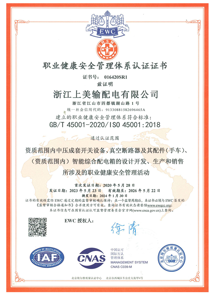 职业健康安全管理体系认证证书