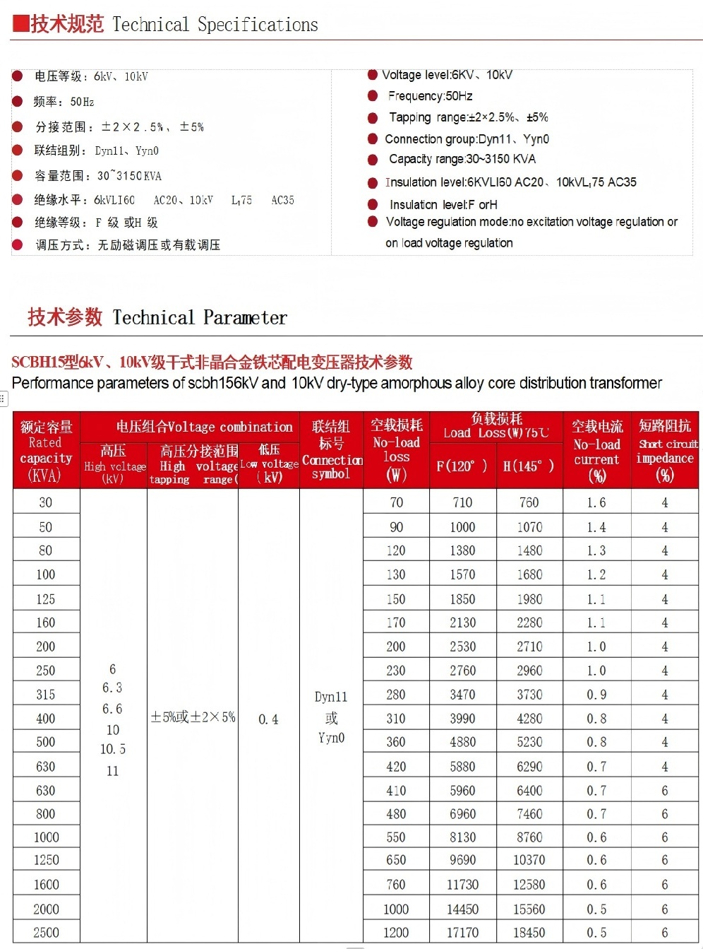 SCBH15系列非晶合金干式变压器是一种新型高效节能变压器产品。产品采用三相五柱或三相三柱式结构,铁芯四周采用框架 结构保护,结构紧凑合理,抗短路能力强。低压线圈采用优质铜箔,铜箔两边呈圆弧形,消除因普通铜箔边缘毛刺的质量隐患。高压线圈采用分段圆筒式结构,德国HTT  薄绝缘带填料技术,真空压力镜面浇注工艺,强度高,稳定性好,确保局部放电量小于10PC。由于其突出的节能环保特性,具有良好的经济效益和社会效益,被广泛应用于机场、车站、城市电网、高层建筑及发电厂等。